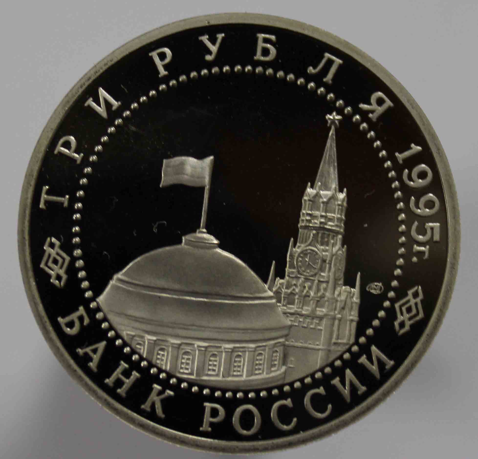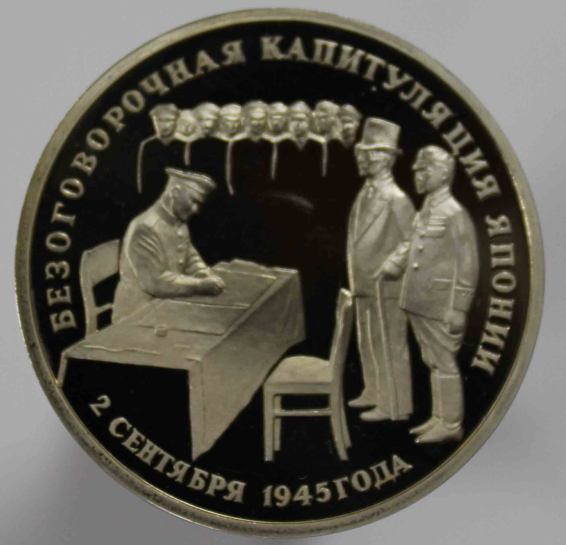 3 рубля 1995г. ЛМД. РФ. Безоговорочная капитуляция Японии, пруф, монета в капсуле.