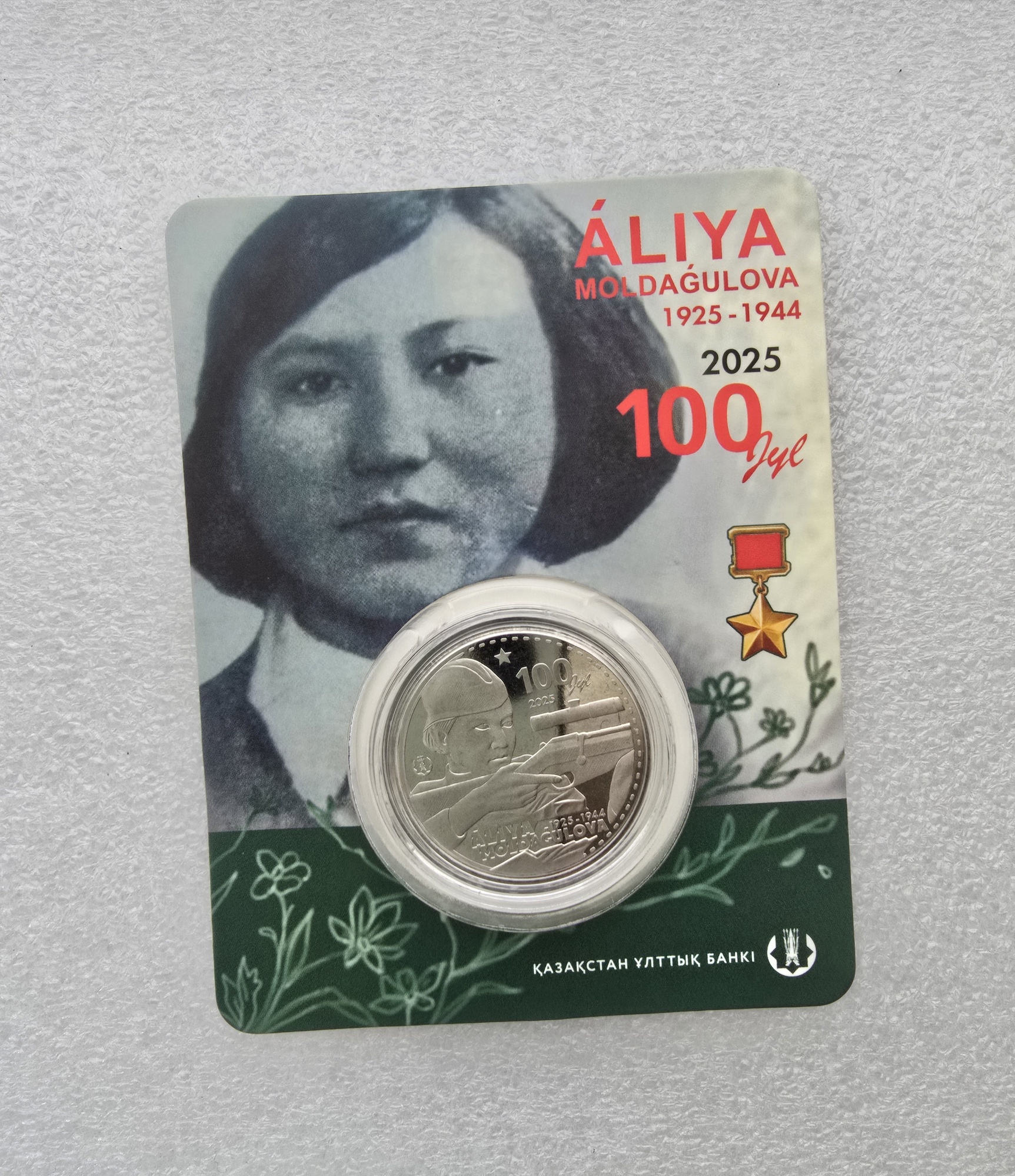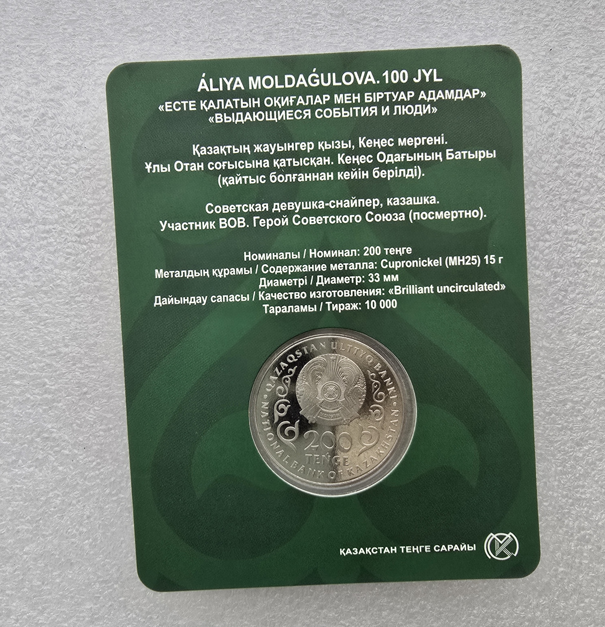 Казахстан. 200 тенге 2025г. 100 лет со дня рождения Герою СССР А. Молдагуловой, в блистере. Тираж 10 тыс. экз.
