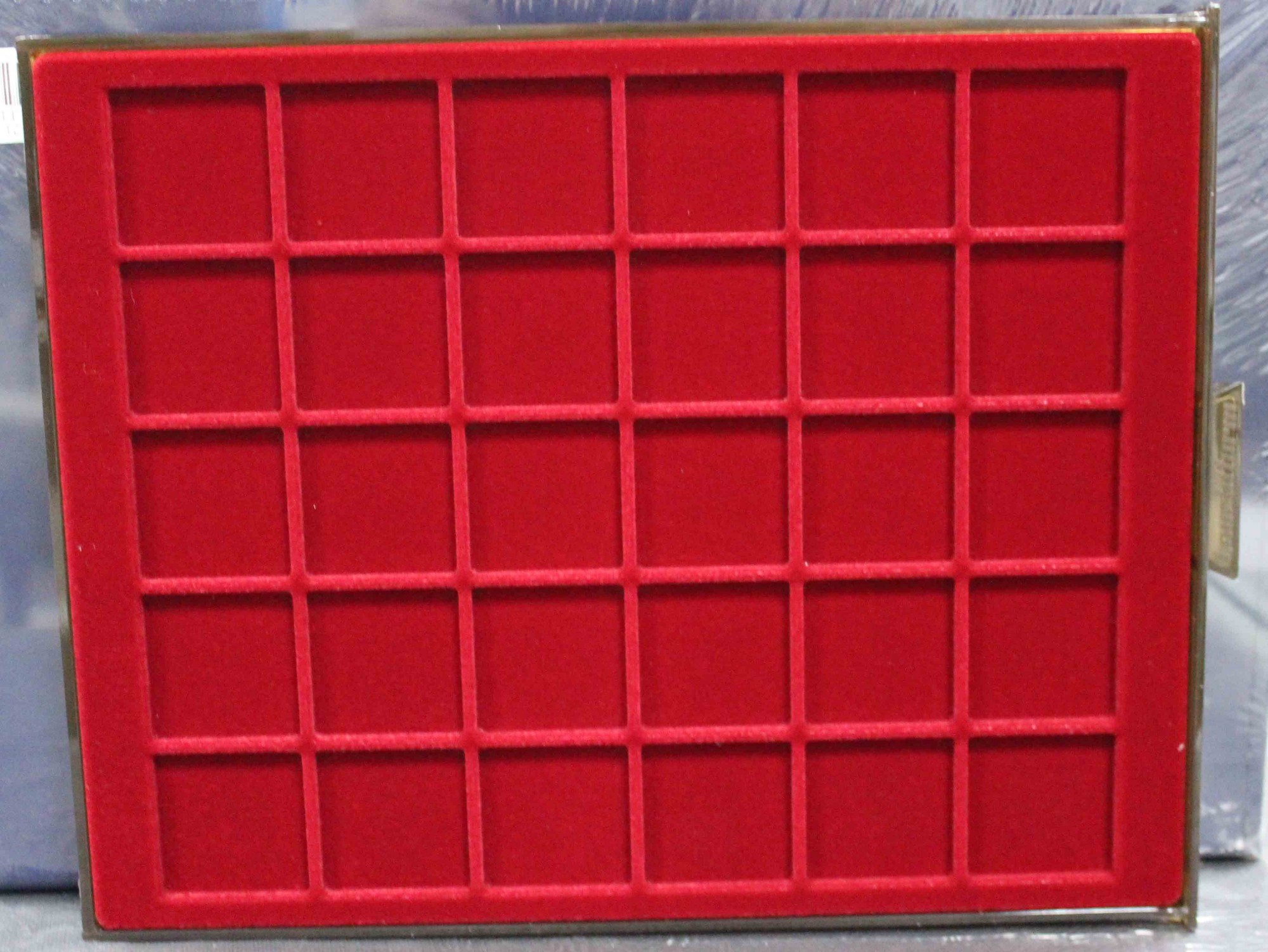 54Размер кассеты: 235х303х20 мм, материал: пластмасса, внутри красный бархат. Диаметр ячейки: 38 мм.