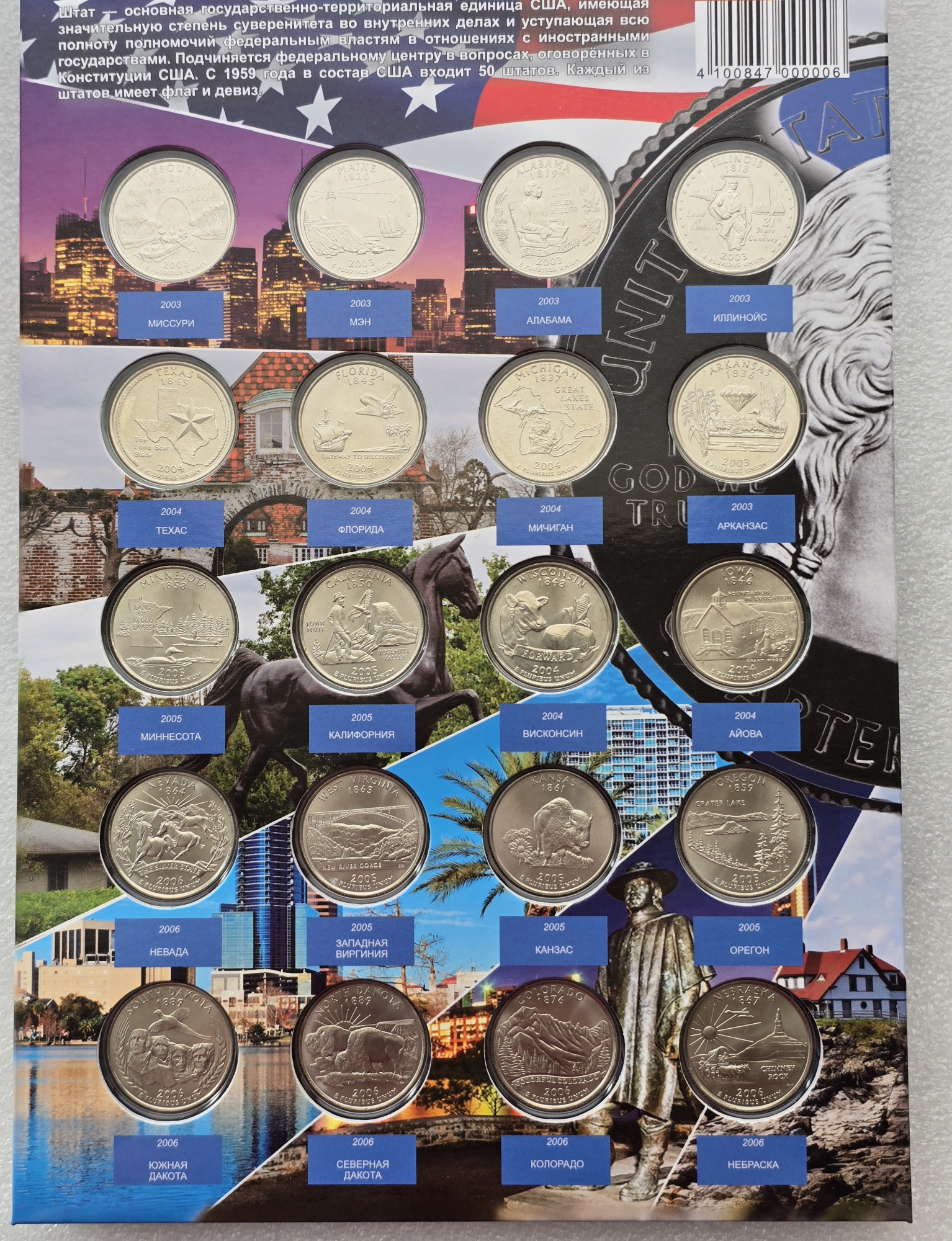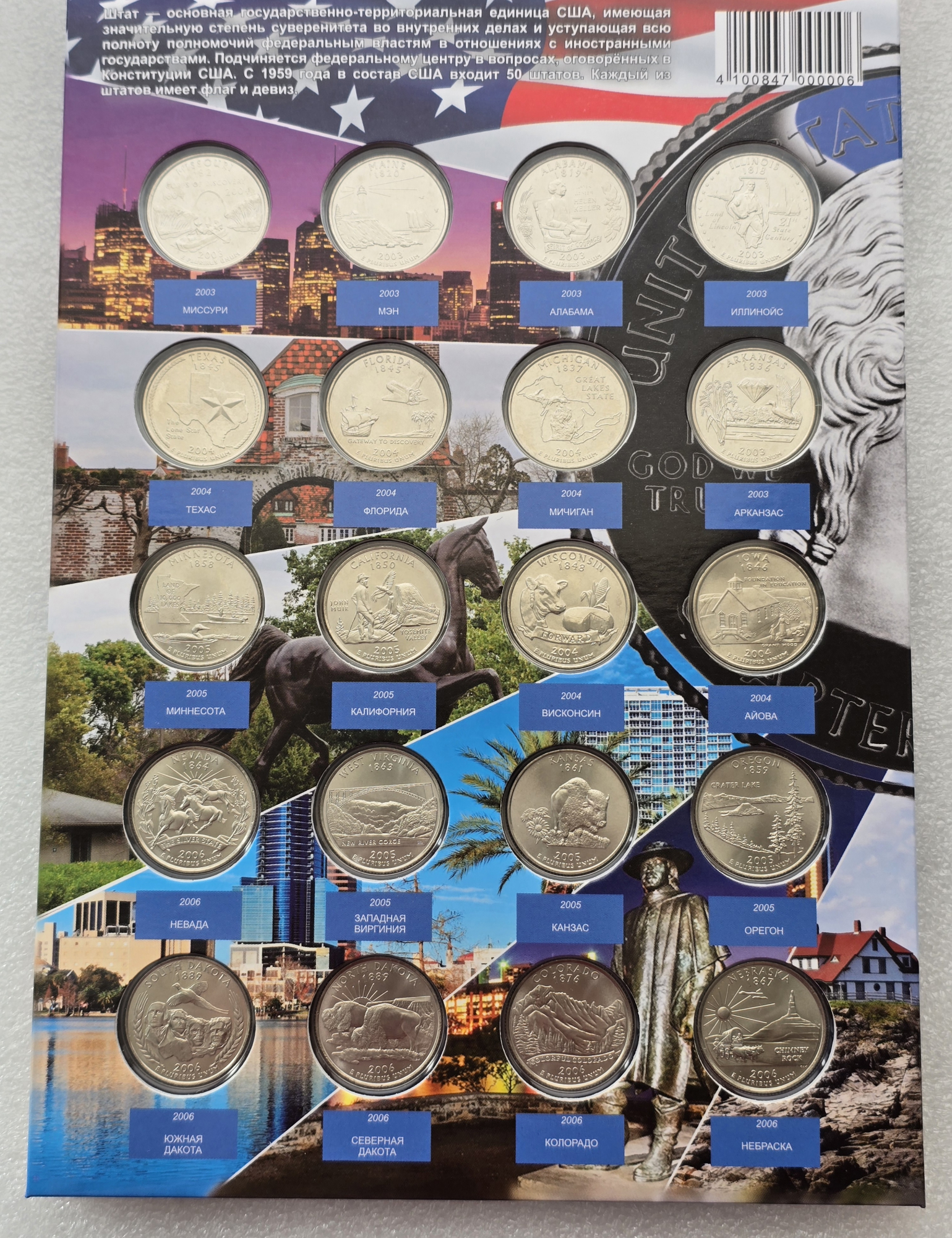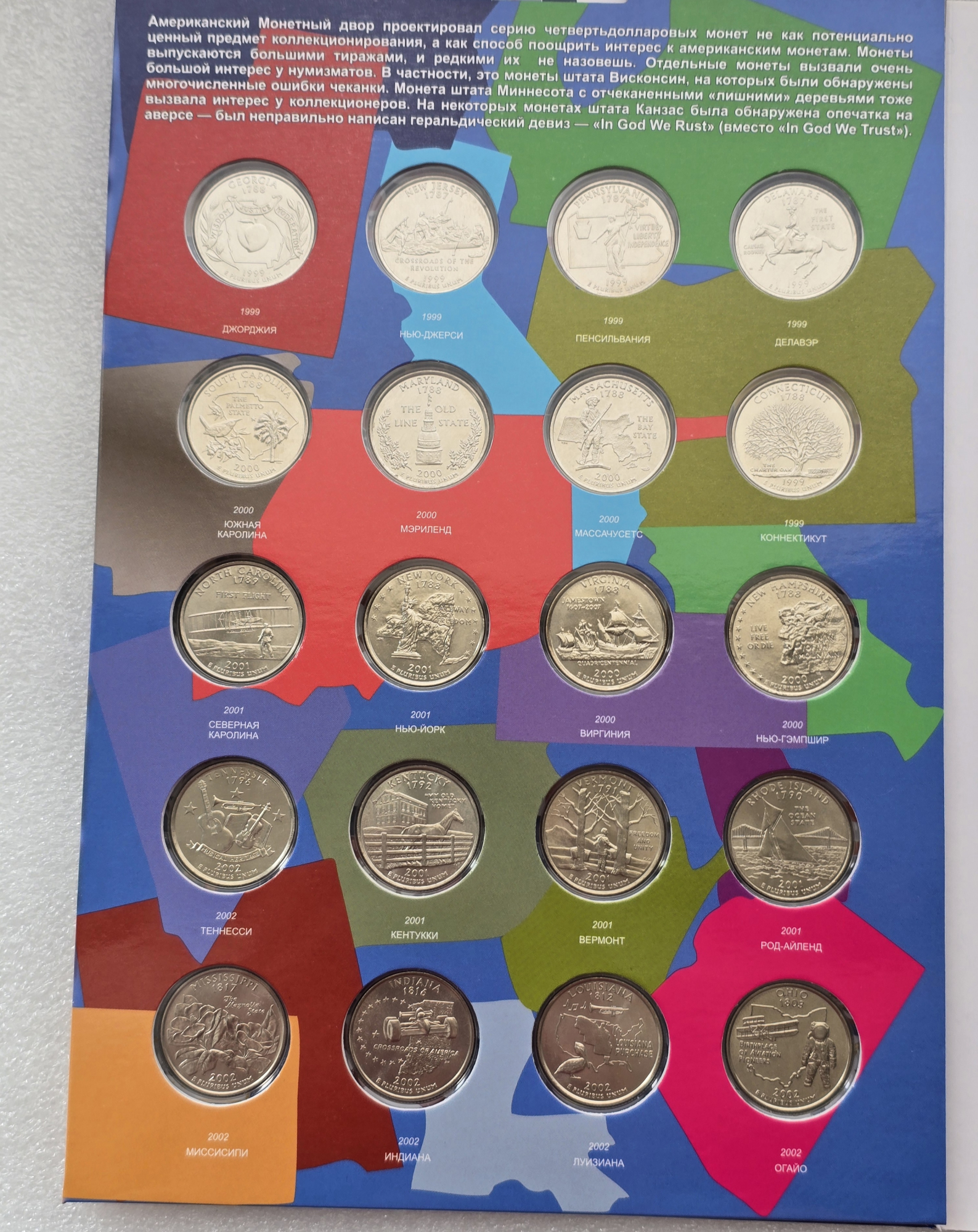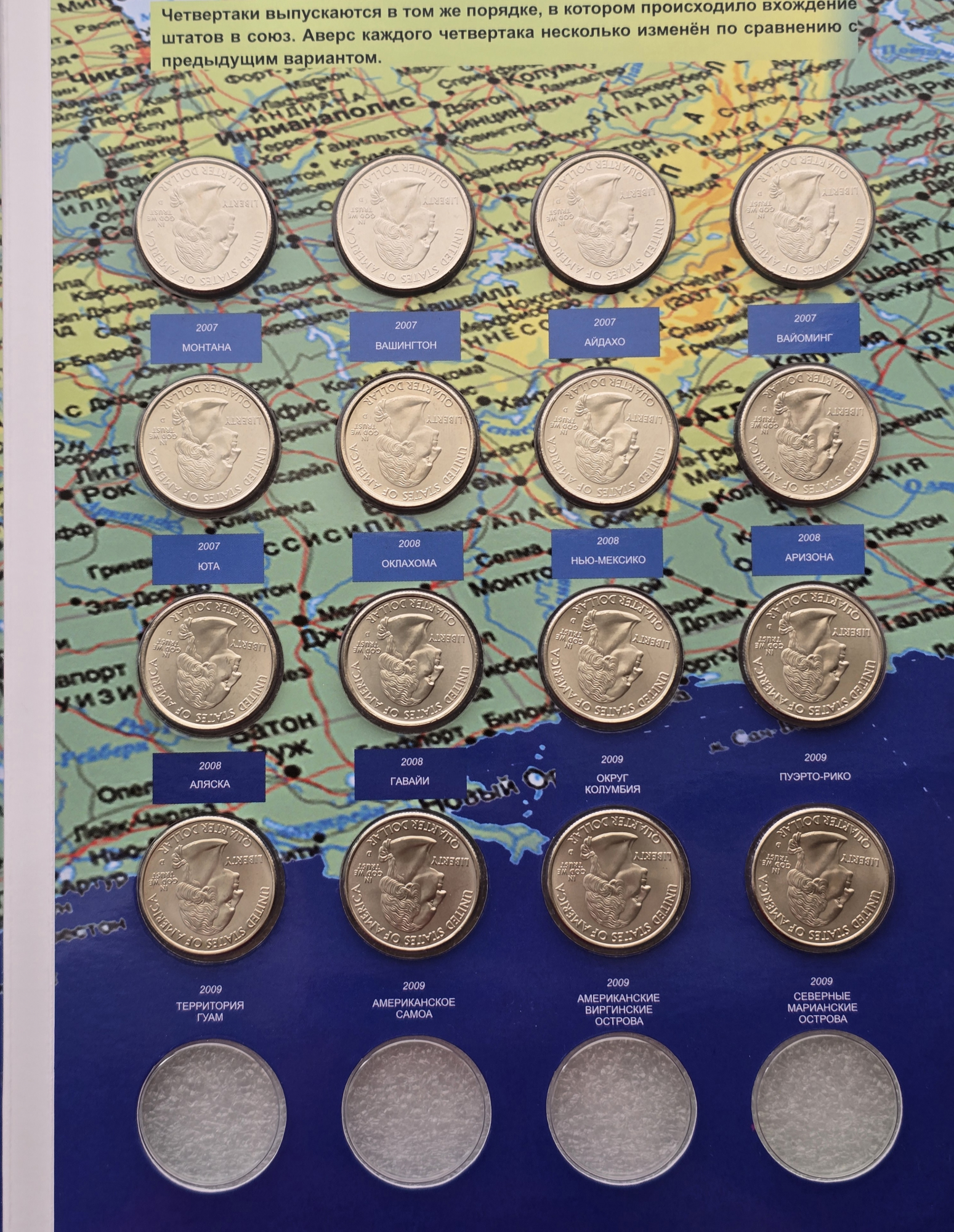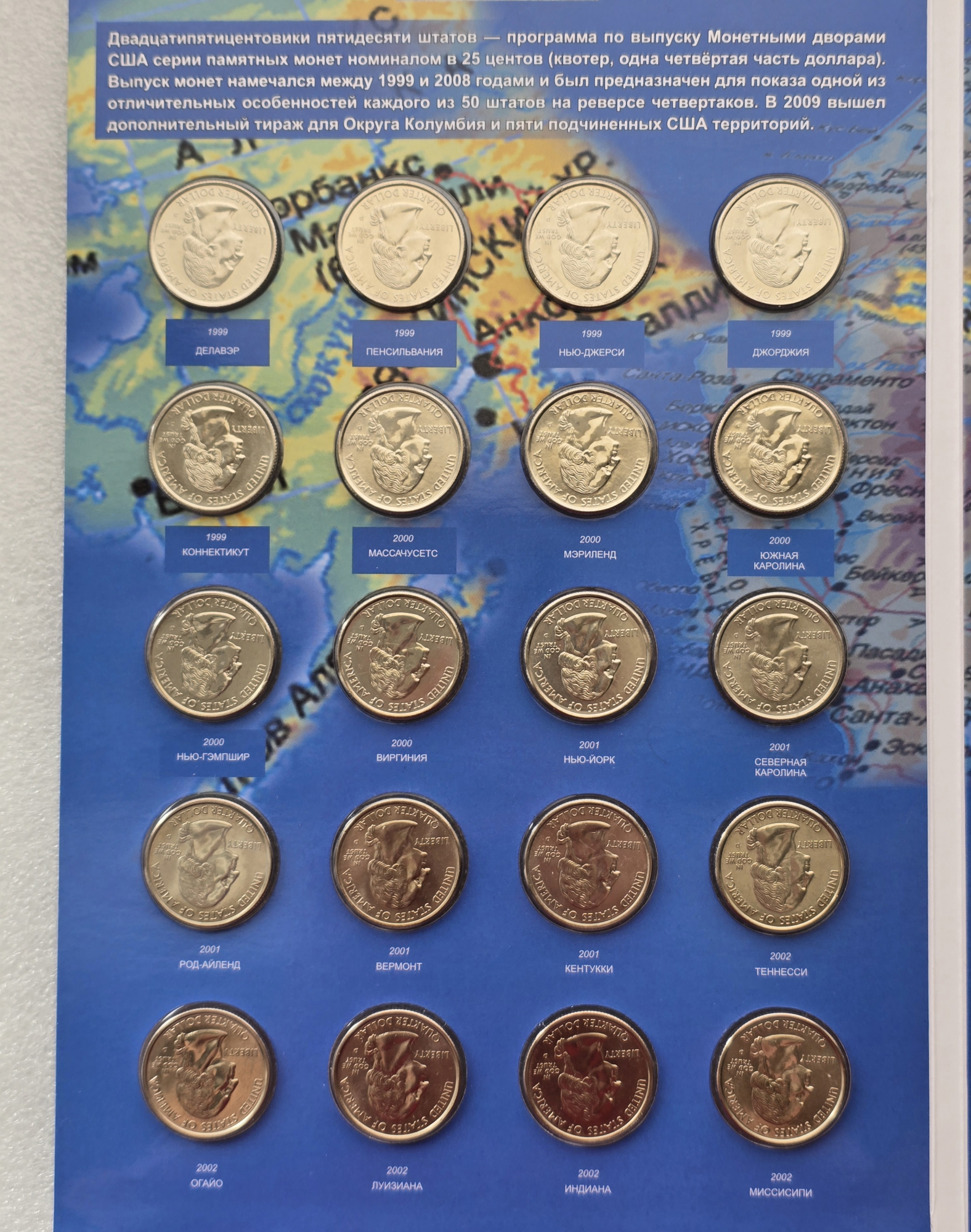 Главная / Магазин / США. Монеты 25 центов 1999-2009г.г.г серии "Штаты и Территории ", оба двора. / США. Полный набор 56 монет- 25 центов 1999-2009г.г. двор D . "Штаты и Территории " , монеты вырезаны из запаек годовых наборов, в блеске. в капсульном альбоме .