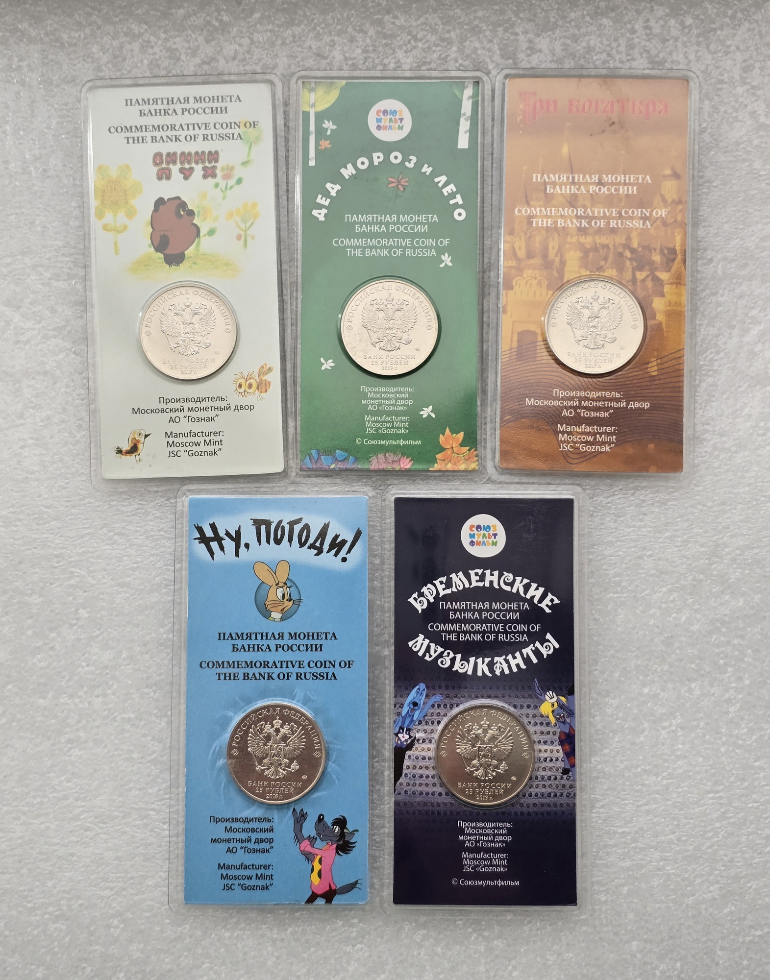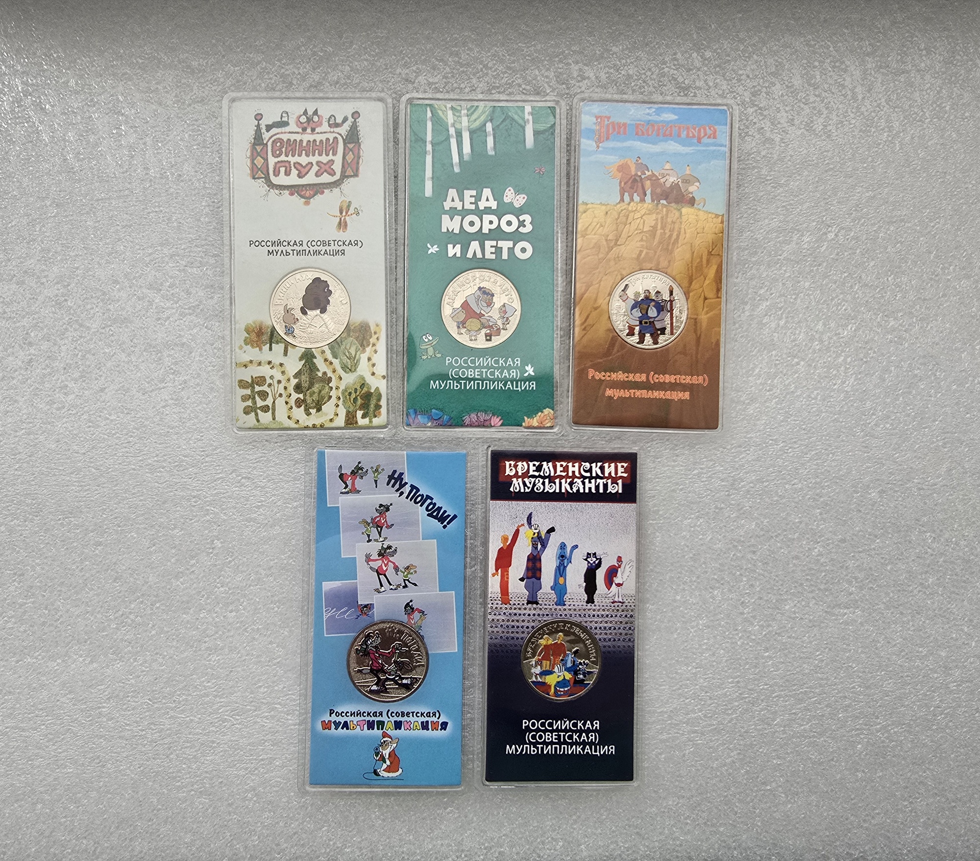 Главная/Магазин/Юбилейные 25-рублевые монеты РФ, / Лот : Винни Пух и Три богатыря, Ну, погоди, Бременские музыканты и Дед Мороз цветные, редкость. Продаются одним лотом 5 первых цветных мультика !!!